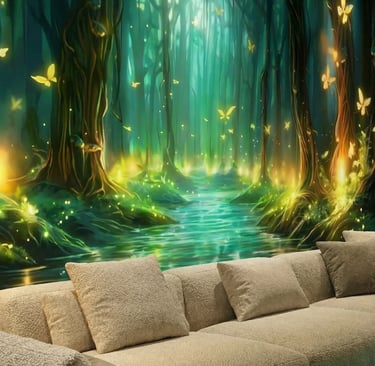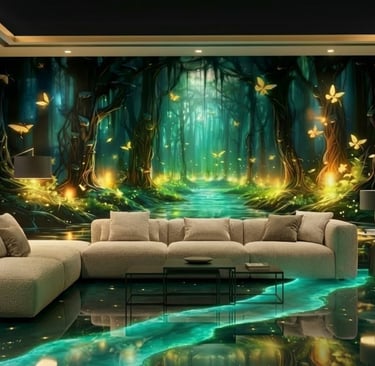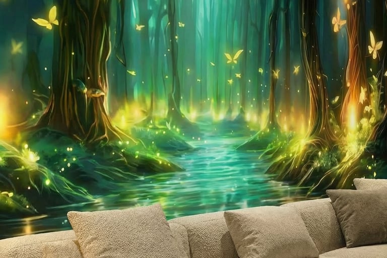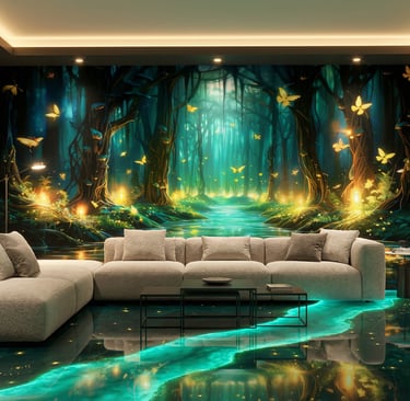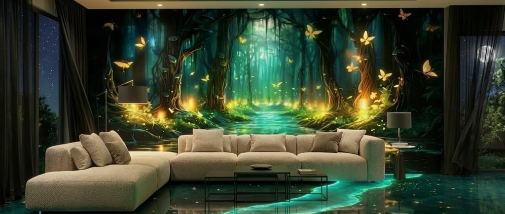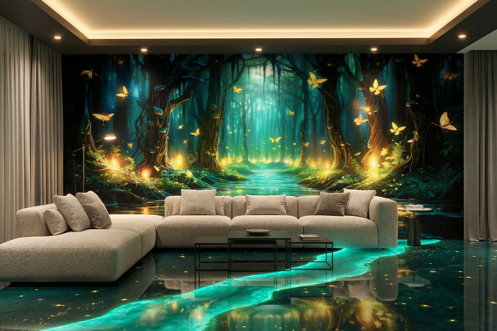 The forest mural was chosen because it creates depth—like a window into another world. The golden “firefly” glow pairs beautifully with warm ambient lighting, while the cool greens and teals keep the space restful. To balance the drama of the mural, we kept the styling modern and clean: a plush modular sofa in soft neutral fabric, minimal tables, and dark-shade lamps for contrast. The result is a room that feels both luxurious and cozy—ideal for winding down at night.